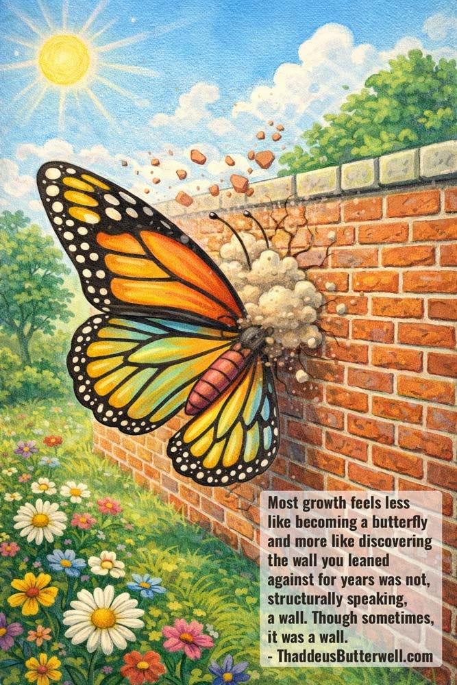 Most growth feels less like becoming a butterfly and more like discovering the wall you leaned against for years was not, structurally speaking, a wall.